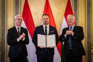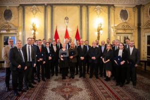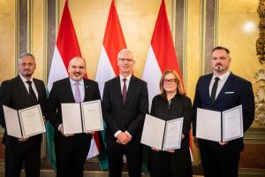 A közös fényképfelvételen vezető munkatársaink, Horváth Sándor, Dr. Szilágyi Béla, Révész Szilvia és Szabó Márk Soltész Miklóssal, a Miniszterelnökség egyházi és nemzetiségi kapcsolatokért felelős államtitkárával láthatók